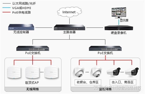 使用吸頂式AP為超市布局無線網(wǎng)絡(luò),美觀大方;在收銀臺、辦公室和倉庫等區(qū)域分別安裝紅外半球攝像機,各出入口、商品區(qū)域配備筒形攝像機,形成無死角監(jiān)控。拓撲中使用PoE交換機通過網(wǎng)線為PoE IPC(網(wǎng)絡(luò)攝像機)和PoE AP供電,可以避免額外布線。本方案支持遠程監(jiān)控。